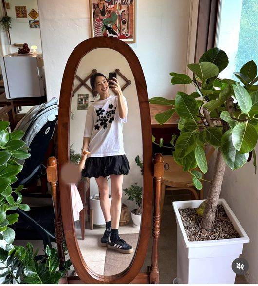 4일 손연재는 자신의 소셜 계정에 여러 장의 사진을 공개했다. 손연재는 클래식한 느낌이 드는 원목 라운드 전신 거울 앞에 서서 아들의 손을 꼬옥 붙든 채 해맑게 웃으며 거울 셀카를 찍었다.