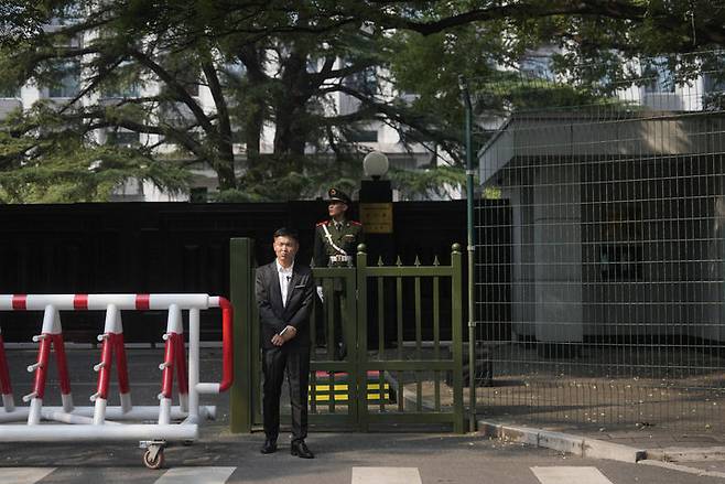 [베이징=AP/뉴시스] 4일(현지 시간) 중국 베이징 주재 북한 대사관 밖에서 보안 관계자들이 경계 근무를 서고 있다. 2025.09.04.