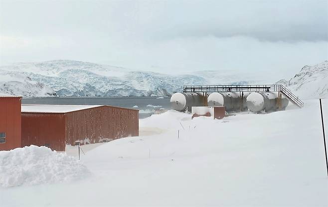 | ▲ 눈 덮인 세종기지 기지 유류탱크 너머로 마리안소만 빙하가 보인다 |