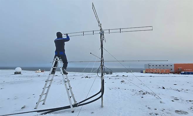 | ▲ 유성레이더 안테나에 붙은 고드름을 제거하는 연구원 |