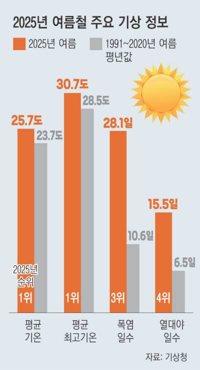 기상청이 4일 발표한 ‘2025년 여름철 기후특성’ 분석 결과를 보면, 올여름 전국 일평균기온은 25.7도로 지난해(25.6도)를 앞질러 역대 1위를 기록했다. 1991~2020년 평년(23.7도)보다 2도 높았다. 전국 폭염일수는 28.1일로 평년보다 17.5일 많은 역대 3위에 올랐다.