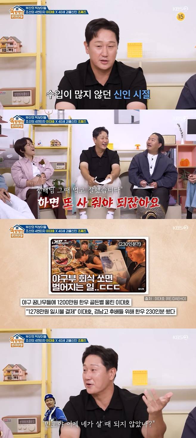 이어 이대호는 "어렸을 때 힘들게 자라왔고 저도 26살 때까지 연봉이 많지 않았는데 가끔 선배들이 밥 사주면 고마웠다. 선배들이 열심히 하라고 방망이 던져주면 너무 좋았다"라며 옛 기억을 떠올렸고, "너무 감사했는데 저도 어느 정도 돈을 벌다 보니까 돼지고기는 사 먹을 수 있는데 소고기는 후배들이 못 사 먹으니까 일부러 비싼 건 사준다"라고 덧붙였다.