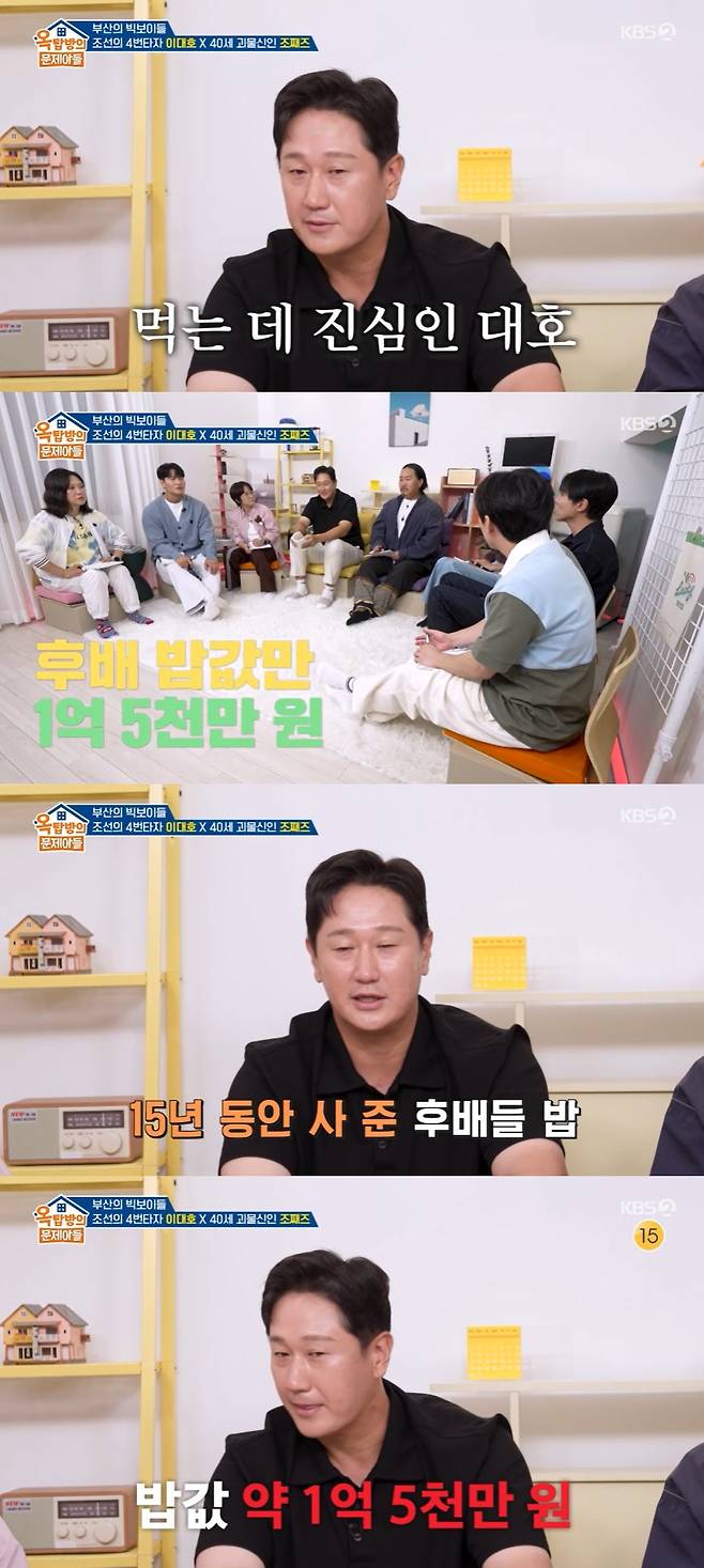 주우재는 이대호가 후배들에게 밥 사준 것만 따져도 아파트 한 채 값은 된다는 것에 화두를 던졌는데, 이대호는 "최근 어림잡아서 계산을 해봤다. 27살 때부터 후배들 밥을 사뒀다. 15년 동안 사줬는데 한 달에 100만 원만 해도 1억 5천만 원 정도 되더라"라고 말해 놀라움을 자아냈다.
