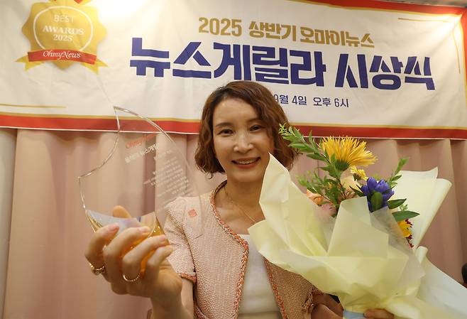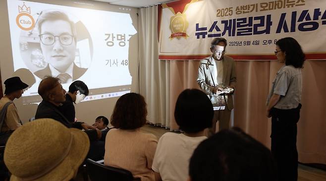 | ▲ 4일 오후 서울 마포구 <오마이뉴스> 서교동 마당집에서 열린 '2025년 상반기 올해의 뉴스게릴라상 시상식'에서 오연호 <오마이뉴스> 대표가 재외국민으로 시상식에 참석하지 못한 강명구 시민기자를 대신해 김미선 <오마이뉴스> 시민저널리즘부 부서장에게 상을 수여하고 있다. |