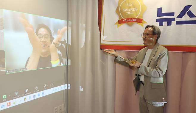 | ▲ 4일 오후 서울 마포구 <오마이뉴스> 서교동 마당집에서 열린 '2025년 상반기 올해의 뉴스게릴라상 시상식'에서 오연호 <오마이뉴스> 대표가 화상 연결을 통해 수상한 서부원 시민기자에게 축하해주고 있다. |