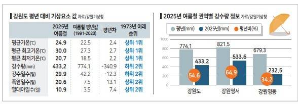 올 여름 강원도의 평균기온이 24.9도로 역대 1위를 기록했다. 반면, 강원도의 여름철 강수량은 평년의 54.6%에 불과해 역대 두번째로 적었다.