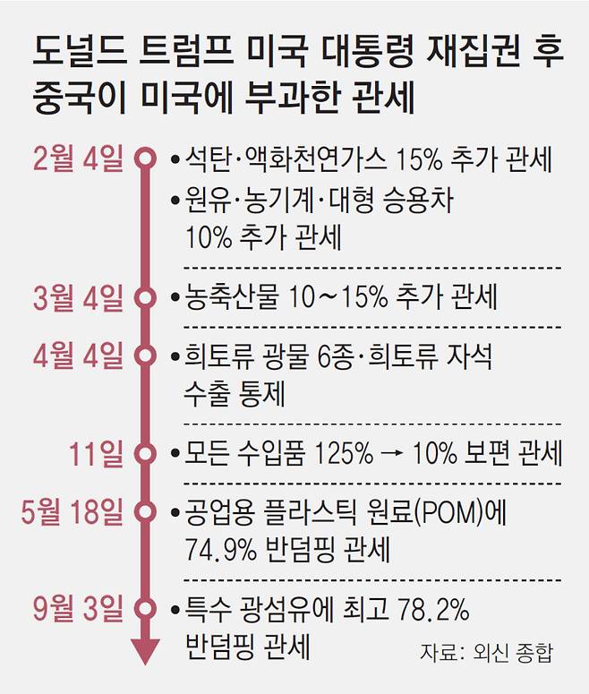 이번 관세 부과는 도널드 트럼프 2기 미국 행정부가 지난달 29일 한국 삼성전자 및 SK하이닉스 등의 중국 공장에 미국산 반도체 장비를 수입할 수 있는 포괄적 허가를 전격 취소한 것에 따른 보복 성격이라는 해석이 나온다. 미국 재무부 또한 3일 미국인을 상대로 ‘오피오이드’의 제조 및 판매에 관여한 혐의로 중국 화학업체 ‘광저우텅웨’와 이 회사 대표자 2명을 제재했다. 합성 오피오이드는 ‘좀비 마약’으로 불리는 펜타닐의 원료다.