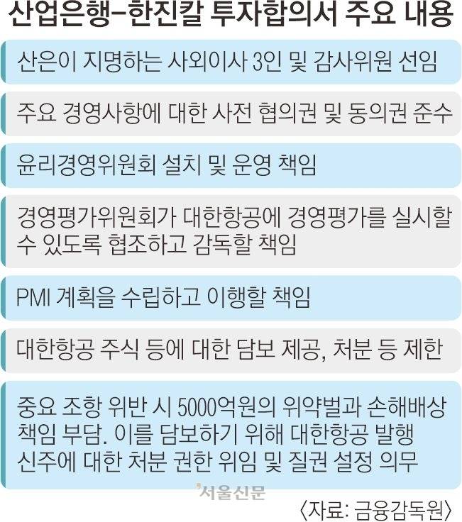 한진칼 지분 10.58%를 보유한 산은이 조 회장의 백기사가 됐다는 비판을 해소하기 위해 산은은 한진칼과 ‘항공산업 구조개편 추진 등을 위한 투자합의서’를 체결했다. 투자합의서엔 ▲산은이 지명하는 사외이사 3명 선임 ▲주요 경영사항에 대한 사전협의권 및 동의권 준수 ▲대한항공 경영평가 실시 및 감독 책임 등 7가지 준수 사항이 담겼다. 당시 산은은 “경영평가를 통해 미흡하다고 판단되면 조 회장이 경영 일선에서 퇴진한다는 의무도 부여했다”고 밝혔다.