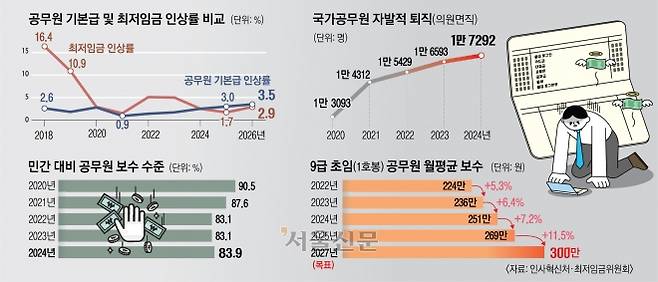 정부는 지난달 29일 국무회의에서 ‘2026년도 예산안’을 의결하며 내년 공무원 보수 인상률을 3.5%로 확정했다. 올해(3.0%)에 이어 2년 연속 3%대 인상이자 2017년 이후 최대폭이다. 내년 최저임금 인상률(2.9%)을 웃도는 데다 공무원보수위원회(공보위)가 권고한 인상률(2.7~2.9%)보다도 높다.