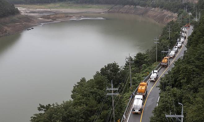 끝없는 급수차 행렬 극심한 가뭄이 이어진 4일 강원 강릉시 오봉저수지 인근 도로를 살수차 및 펌프트럭들이 운반급수를 위해 줄지어 이동하고 있다. 강릉시민의 생활용수 87%를 공급하는 오봉저수지 저수율은 이날 오전 기준 13.5%로 낮아졌다. 강릉=뉴시스