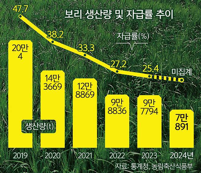 보리 생산량 감소는 식량 안보 문제와도 직결된다. 보리는 쌀, 밀 등과 더불어 주요 식용 곡물 중 하나이기 때문이다. 1990년대 100%에 가깝던 보리의 자급률은 2023년 기준 25.4%로 대폭 떨어진 상태다. 정부는 2029년까지 보리 자급률을 34.6%까지 끌어올린다는 목표를 세웠지만 자급률은 오히려 계속 떨어지는 추세다.