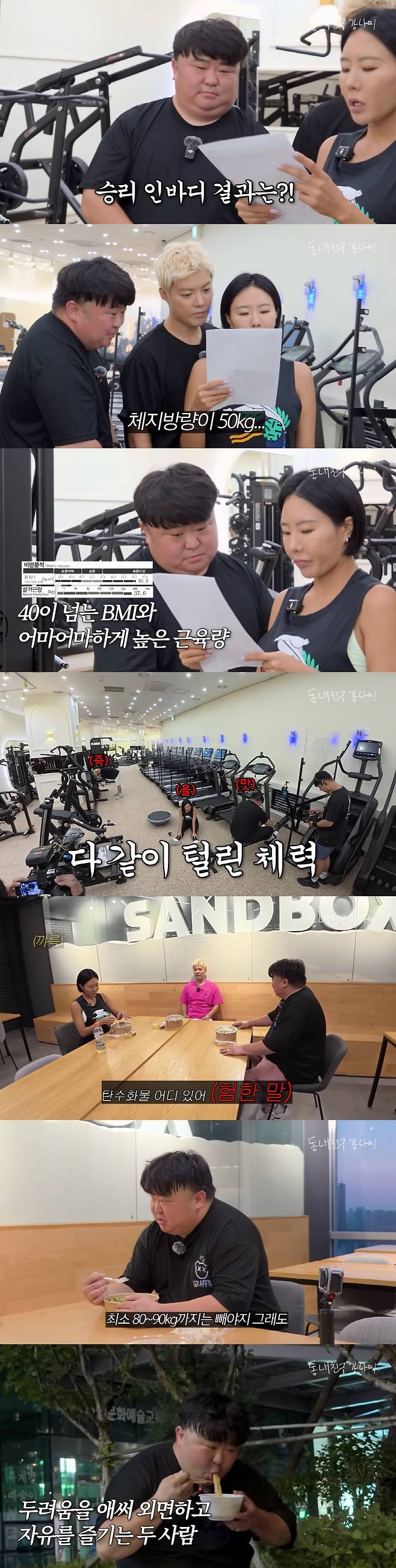 운동 여부를 묻자 승리 씨는 "두 달 동안 바짝 했는데 지금은 안 한다"고 답했고, 결국 이상화는 그의 인바디를 측정했다. 결과는 체지방량 50kg, BMI 40.9. 이상화는 "볼 것도 없다. 바로 운동하자"며 운동을 시작했다.