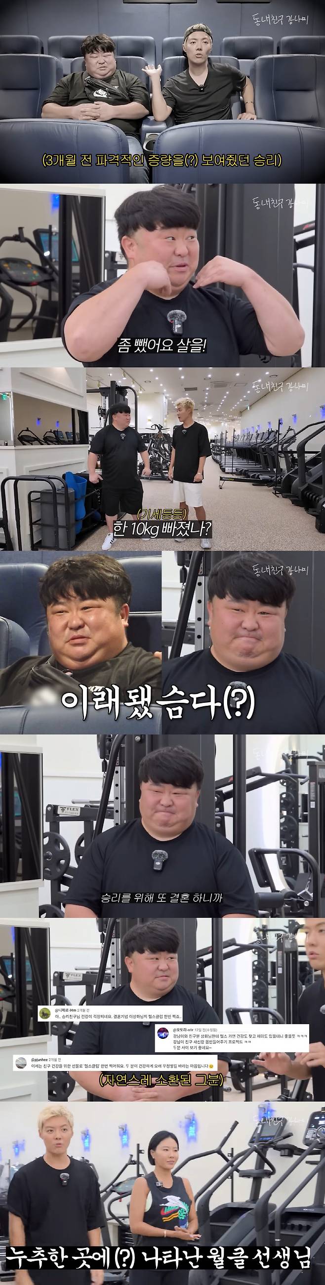 승리 씨는 영상에서 "3개월 전 출연 후 '건강을 위해 살을 빼라'는 댓글을 보고 10kg 정도 감량했다"고 밝히며 근황을 전했다. 이에 강남은 "아무도 모를 정도로 티가 안 났다. 원래 워낙 덩치가 컸다"며 너스레를 떨었다.