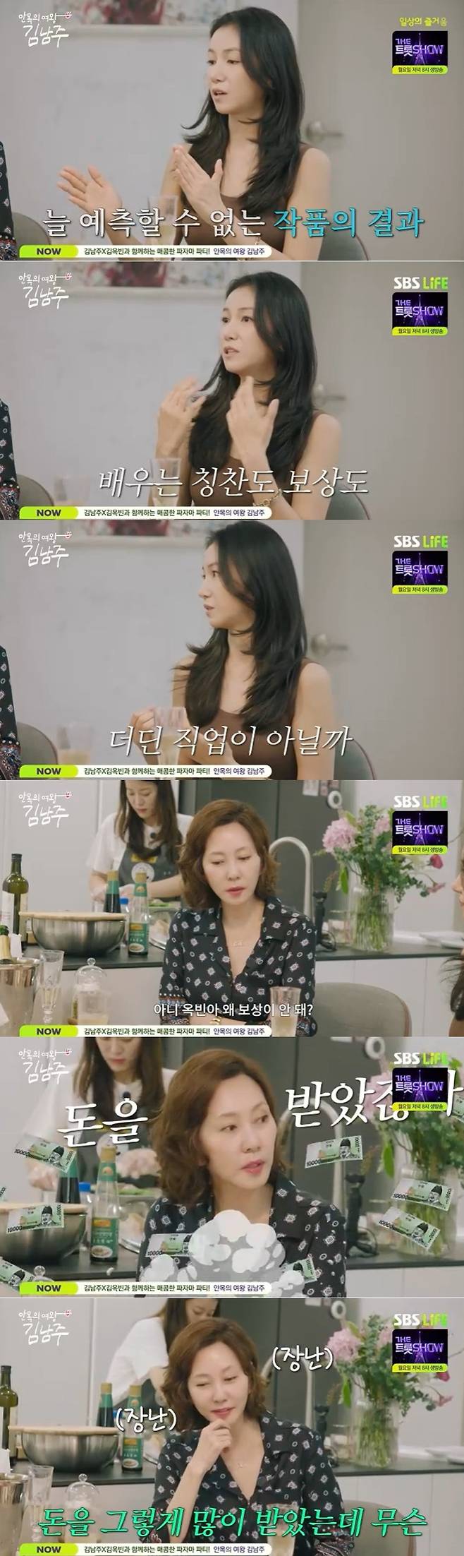 이에 김남주는 "옥빈아 왜 보상이 안 되냐. 돈을 받았잖아. 돈을 그렇게 많이 받았는데 무슨"이라고 쿨하게 돌직구를 날리며 "결과는 우리 것이 아니다. 잘 나오면 너무 기쁘고 결과 안 좋으면 심장이 내려앉는다"고 운을 뗐다.