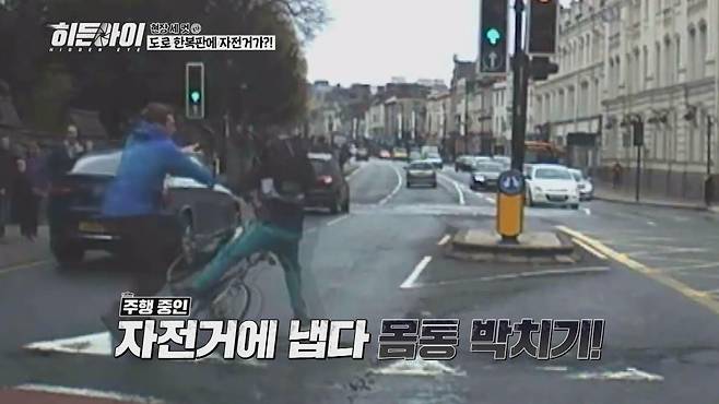 현장 세 컷에서는 자전거를 타고 달리던 남성이 갑작스러운 몸통 박치기를 당한 장면이 펼쳐진다.