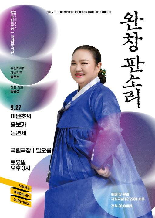 국립극장 전속단체인 국립창극단은 '완창판소리-이난초의 흥보가'를 9월 27일 서울 중구 국립극장 달오름극장에서 공연한다.