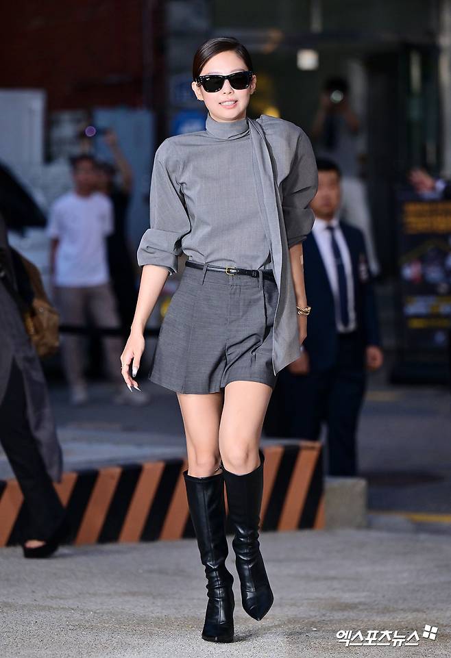 이날 제니는 하이넥 디테일이 돋보이는 그레이 셋업 셔츠와 쇼츠를 매치해 도시적인 무드를 완성했다. 여기에 블랙 벨트로 실루엣에 포인트를 주며, 블랙 롱부츠로 강렬한 스타일링을 마무리했다.