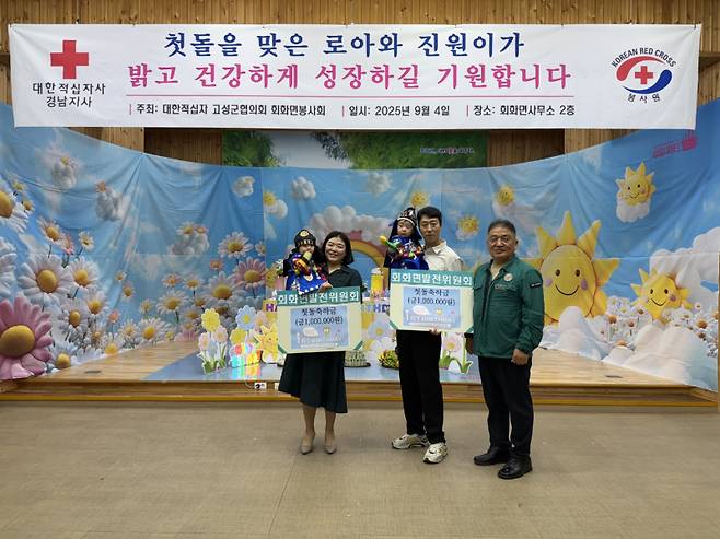특히 이날 행사에는 대한적십자사 고성군협의회 회화봉사회(회장 최종숙)가 정성 가득한 잔치상을 준비해 참여자들에게 대접했다. 회화면 발전협의회에서는 돌잔치 주인공에게 각각 100만원의 격려금을 지원하며 축하 분위기를 더했다. 이장단과 주민들이 함께 어울리며 웃음과 격려가 넘쳐 더욱 뜻깊은 시간이 됐다.