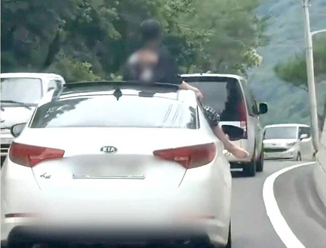 운영자가 제보받아 공개한 영상 속에는 흰색 K5 승용차에 탄 남성이 선루프로 상반신을 내밀고, 나아가 창문 밖으로 다리까지 뻗은 모습이 담겼다.