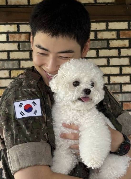 차은우는 짧게 자른 머리에 군복을 입고 환한 미소로 반려견을 품에 안고 있는 모습이다.