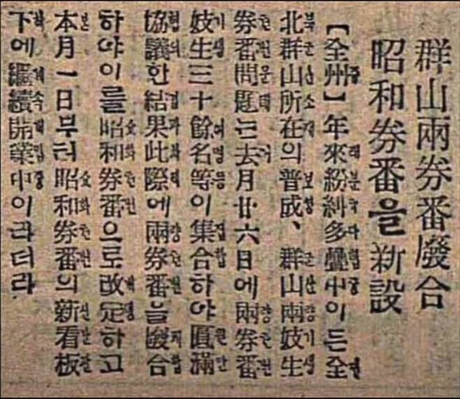 <매일신보>는 조선총독부 기관지로 알려진다. 신문은 "양(보성, 군산) 권번 기생 30여 명이 모여 원만 협의한 결과 차제에 양 권번을 폐합하야 이를 소화권번으로 개정하고..."라고 했는데, 실제는 경찰 당국이 깊이 개입한 것으로 보인다. 두 신문 기사에서 '원만 협의'와 '권고'는 말이 좋아 '협의'이고 '권고'이지 일제의 강압, 즉 '회유와 협박'이었음은 '불문가지'다.