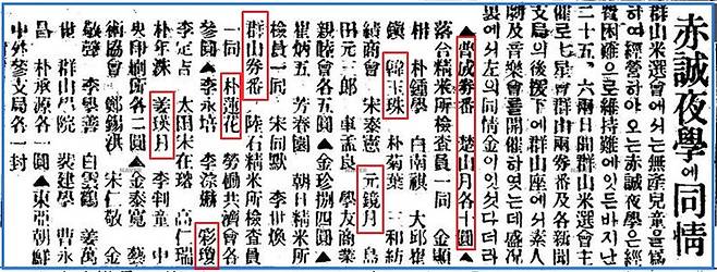 | ▲ 적성 야학에 동정금 전달한 보성권번과 군산권번 기생들 기사(1927년 5월 2일 자 ‘동아일보’) |