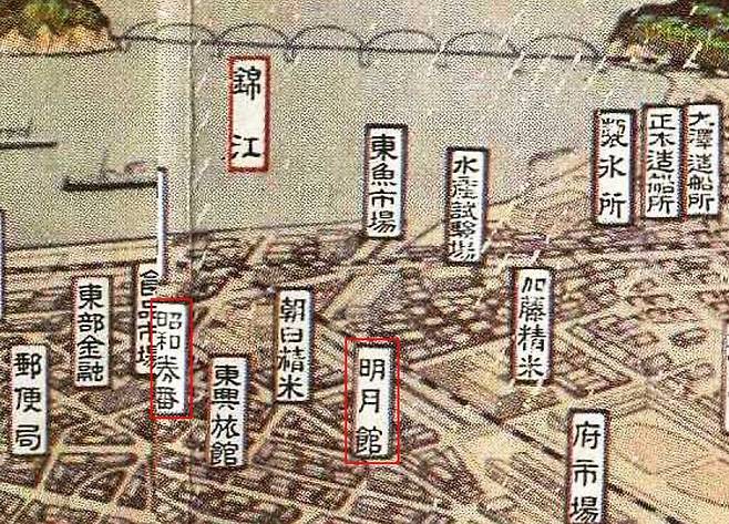 | ▲ 소화권번과 명월관 등재된 군산부 조감도(1934) |
