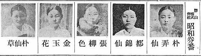 | ▲ 1939년 동아일보 신년 광고에 소개된 군산소화권번 기생들. |
