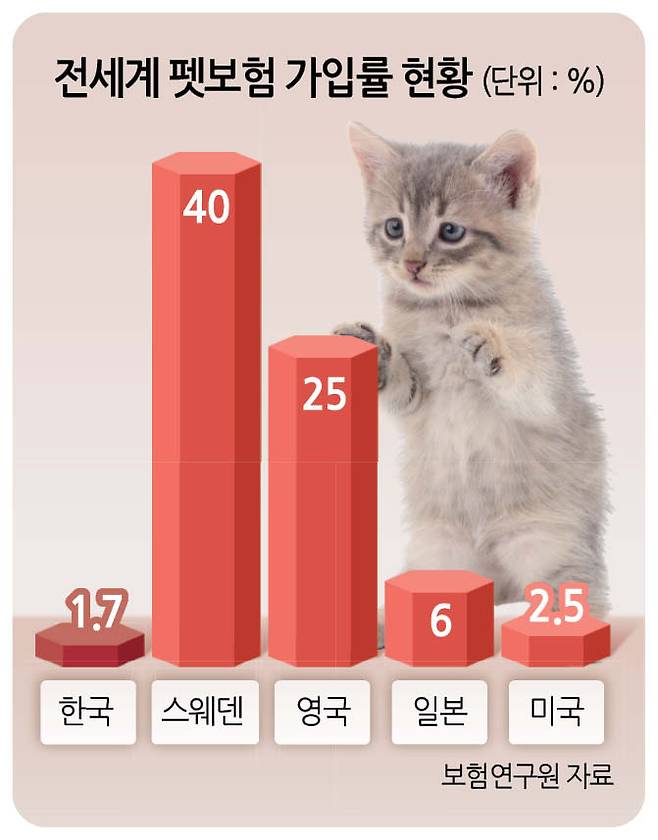 보험연구원에 따르면 지난해 상반기 기준 국내 펫보험 가입률은 약 1.7%로, 스웨덴(40.0%), 영국(25.0%)에 비해 크게 낮은 수준이다. 펫보험에 대한 소비자 인식이 여전히 낮다는 얘기다.