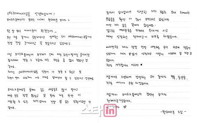'보이즈2플래닛' 탈락 한해리준, 자필 편지로 전한 진심