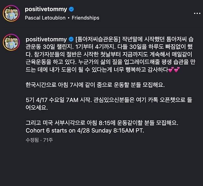 지난해 4월 22일. 솔직히 말하자면, 나는 한 달도 채 하지 못할 거라 생각했다. SNS에서 우연히 본 '탐아저씨'의 '함께 운동할 사람 모집' 글. 친구가 말했다.