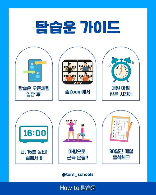 '탐습운'은 전 세계 시차에 맞춰 종일 열린다. 누구든, 어디서든, 접속만 하면 작은 화면은 피트니스 센터가 된다. '탐습운'은 매월 1일 신입 기수를 모집한다. 참가비는 무료. 다가오는 10월 1일 아침 8시 30분, '탐습운' 22기가 시작된다.