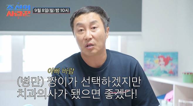 또 김병만은 "짱이가 선택하겠지만 치과의사가 됐으면 좋겠다"며 딸이 의사 길로 가길 바라는 마음을 담아 선물한 의사 놀이 장난감 세트를 꺼냈다. 그는 "(짱이가) 치과 의사 되겠다고 했다"며 주입식 꿈 교육에 성공했다고 자신 있게 밝혔다.