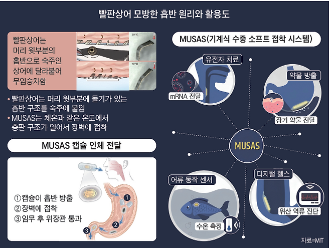 MIT 연구진은 인공 흡반 이름을 ‘기계식 수중 소프트 접착 시스템(Mechanical Un-derwater Soft Adhesion System)’의 영문 머리글자를 따 무사스(MUSAS)로 정했다. 연구진은 무사스가 돼지 위 조직과 수술용 장갑, 살아있는 역돔 등 다양한 부드러운 표면에 달라붙는 것을 확인했다.