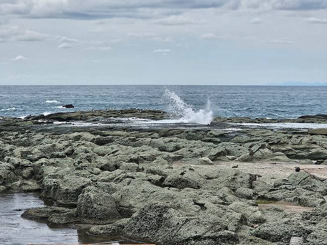 다음날 리조트시라카미 3호를 다시 탑승합니다. JR센조지키 역에 약 15분간 정차합니다. 천장의 다다미를 깔은 듯한 넓은 용암 대지가 바닷가 바로 옆에 위치하죠. 긴 시간은 아니지만 사진을 찍기에 충분한 시간이여서 모두들 나가서 사진을 찍어 봅니다. 타이밍만 잘 맞추면 작은 틈 사이로 바닷물이 용출하는 순간도 촬영이 가능 합니다.