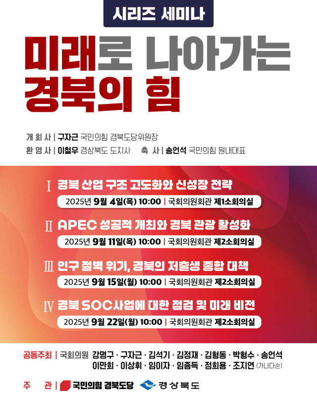 '미래로 나아가는 경북의 힘'을 주제로 진행되는 릴레이 세미나는 이달 중 세 차례가 더 열릴 예정이다. 오는 11일에는 'APEC 성공개최와 경북 관광 활성화', 15일에는 '인구 절벽 위기, 경북의 저출생 종합 대책', 22일에는 '경북 SOC 사업에 대한 점검 및 미래 비전'을 주제로 각각 진행된다.