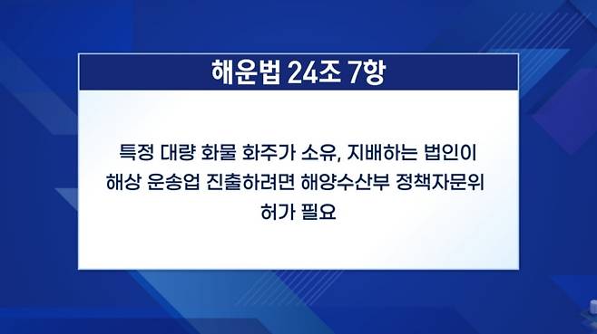 해운법에 따르면 특정 대량 화물의 화주가 소유하거나 지배하는 법인이 해상 운송 사업을 하려면 해양수산부의 허가가 있어야 합니다.