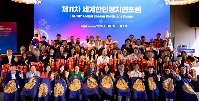 [서울=뉴시스] 5일 서울 중구 더플라자호텔에서 열린 제11차 세계한인정치인포럼 폐회식에서 참가자들이 한국의 전통문양을 그려진 '뮤지엄 굿즈'를 들고 기념촬영 하고 있다. (사진=세계한인정치인포럼 제공) 2025.09.05. photo@newsis.com *재판매 및 DB 금지
