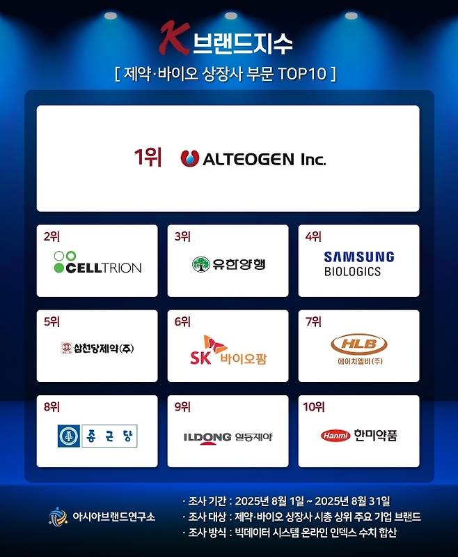 한정근 아시아브랜드연구소 대표는 "K-브랜드지수 제약·바이오 상장사 부문에서는 알테오젠이 1위를 수성하며 독주 체제를 지속 중이며, SK바이오팜과 한미약품이 신규 진입하는 등 순위 변동이 두드러졌다. 이는 글로벌 신약 파이프라인 확대 및 기술 수출 성과에 대한 시장 기대감이 브랜드 경쟁력에 직접적으로 반영된 결과로 풀이된다"고 설명했다.