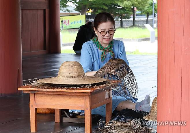 (제주=연합뉴스) 백나용 기자 = 5일 오후 제주시 제주목 관아 일대에서 열린 '2025 제주 무형유산 대전'에서 홍양숙 정동벌립장 보유자가 정동벌립 제작 시연을 하고 있다. 정동벌립은 테우리('목동'을 뜻하는 제주어) 또는 농부들이 일할 때 쓰는 모자의 일종으로, 제주도 고유의 향토문화유산이다. 2025.9.5