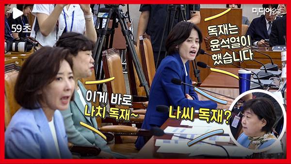 이렇게 국힘의힘의 반발에도 김용민 위원장이 입법청문회를 예정대로 진행하려 하자, 곽규택 국민의힘 의원이 “나갑시다”라고 동을 뜨고 일어났다. 나경원 의원과 조배숙 의원도 일어났다. 곧바로 회의실을 나가는 나경원 의원 뒤로 박은정 의원의 목소리가 꽂혔다. “일도 안 하고 세비 받습니까? 일도 안하고 세비 받아요?” 영상엔 마이크가 꺼진 채 나경원 의원의 '나치 독재' 발언에 박은정 의원과 서영교 의원이 비꼬는 생생한 현장음이 담겼다.