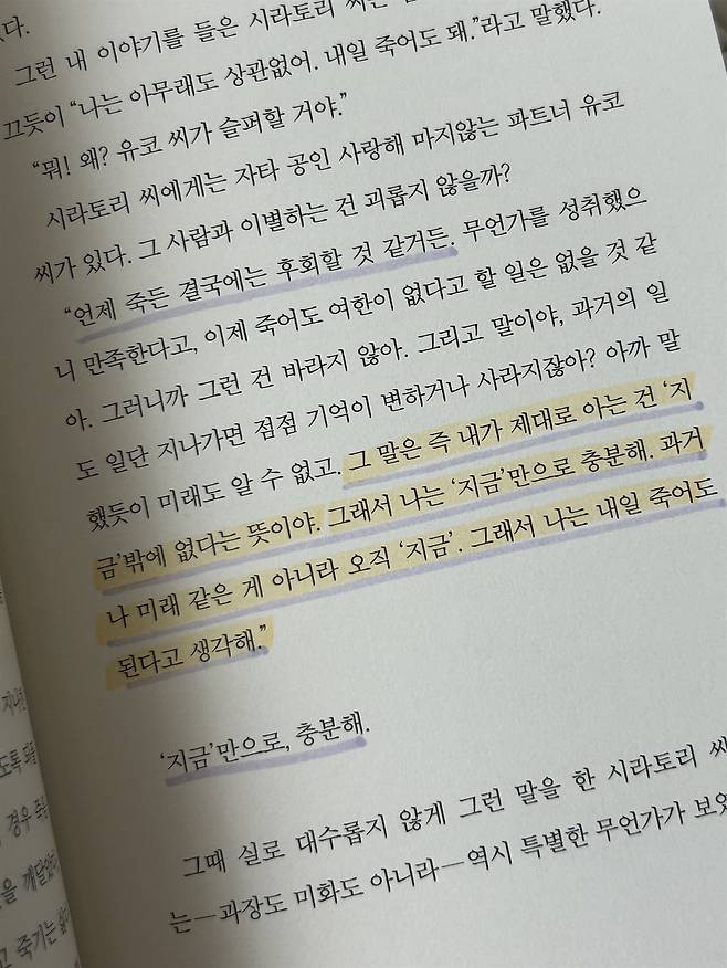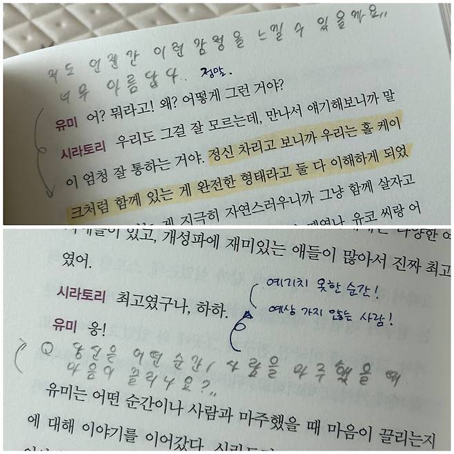 미사여구도, 정돈된 말이 아니어도 된다. 우리는 그 속에서 그보다 많은 것을 공유할 수 있었다. 반듯하게 그어보려 했으나 조금 어긋난 밑줄에서도, 대체 이건 무슨 글자지 의심케 하는 손글씨에서도 오히려 웃음이 났다. 완벽하지 않은 말들이지만 그 연결성을 책 내용이 보완해주니 든든하기 짝이 없었다. 이따금 서로 좋았던 문장이 겹쳐 두 개의 밑줄이 생겨날 때면 어쩐지 공명하는 기분이 들었다.