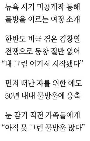 이번 전시를 준비하는 과정에서 유족을 통해 전해진 작가의 마지막 육성은 "나는 여전히 못 그린 물방울이 많다"였다. 50년을 그렸는데도 그에게는 더 흘러내릴 물방울이 남아 있었나 보다.