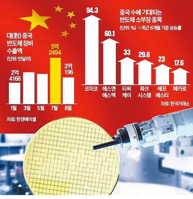 국내 소부장 업체의 호조는 수출 데이터를 통해서도 확인된다. 대체데이터 플랫폼 한경에이셀(Aicel)에 따르면 지난 7월 반도체 제조용 장비의 대(對)중국 수출액은 전년 동기 대비 53.81% 급증한 5억2494만달러(약 7306억원)를 기록했다. 2021년 4월 이후 월별 기준으로 4년 만의 최대치다. 지난달 수출액(잠정치)은 3억196만달러로 전월 대비 줄었지만 전년 동기보다는 16.78% 늘었다.