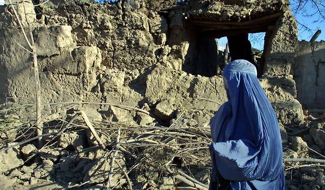 ▲ 아프간 여성이 지진으로 파괴된 건물 잔해 옆을 지나가고 있다.