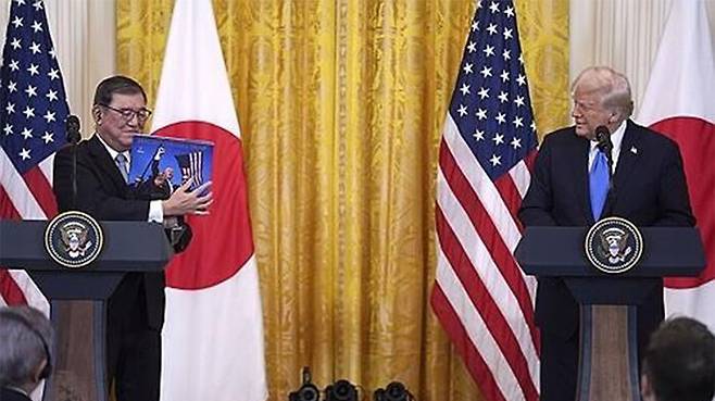 ▲ 트럼프 미국 대통령과 이시바 시게루 일본 총리가 지난 2월 7일(현지시간) 백악관에서 회담한 뒤 기자회견에서 발언하고 있다.