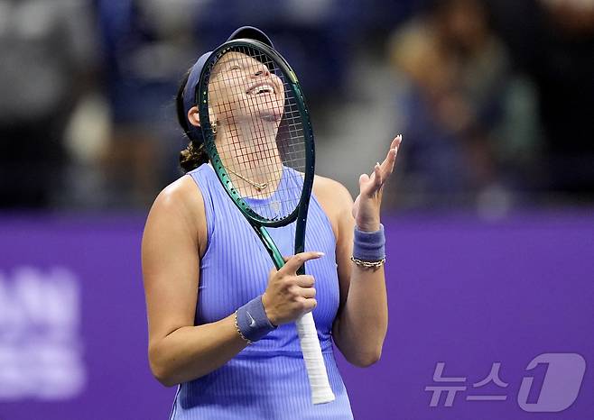 (뉴욕 로이터=뉴스1) 심서현 기자 = 4일(현지시간) 어맨다 아니시모바(9위·미국)가 미국 뉴욕 빌리진킹 내셔널 테니스센터에서 열린 US오픈 여자 단식 준결승에서 오사카 나오미(24위·일본)를 꺾고 승리를 자축하고 있다. 2025.09.04.