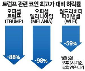 특히 트럼프 대통령의 차남 에릭 트럼프를 주축으로 출시한 탈중앙화 금융(디파이) 프로젝트 월드리버티파이낸셜(WLFI)의 경우 상장 나흘 만에 최고가 대비 60% 폭락했다.