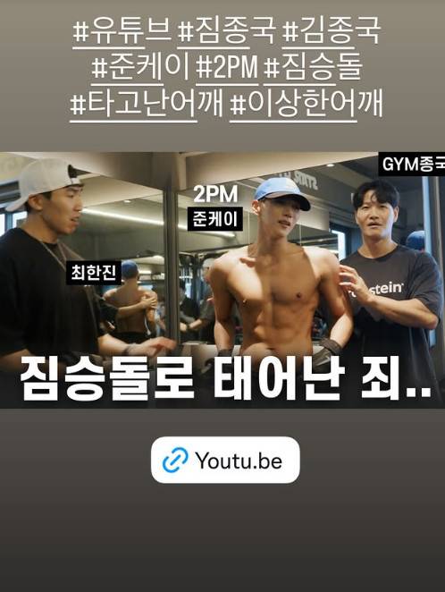 김종국은 2PM 준케이, 보디빌더 최한진을 만난 근황이 담긴 유튜브 콘텐츠 영상 썸네일을 게재하며 링크도 함께 첨부했다. 그러면서 "#유튜브 #짐종국 # 김종국 #준케이 #2PM #짐승돌 #타고난 어깨 # 이상한 어깨"라는 해시태그를 더했다.