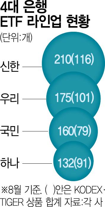 제도가 도입된 지난해 10월 이후 국내 4대 시중은행은 증권사 쏠림을 견제하기 위해 일제히 ETF 라인업을 보강했다. 신한은행은 지난해 10월 말 151개에서 지난달 말 기준 210개로 늘렸고 우리은행도 같은 기간 146개에서 175개로 확대했다. 국민은행은 101개에서 160개로, 하나은행은 98개에서 132개로 각각 늘리며 퇴직연금 고객 유치 경쟁에 나섰다.